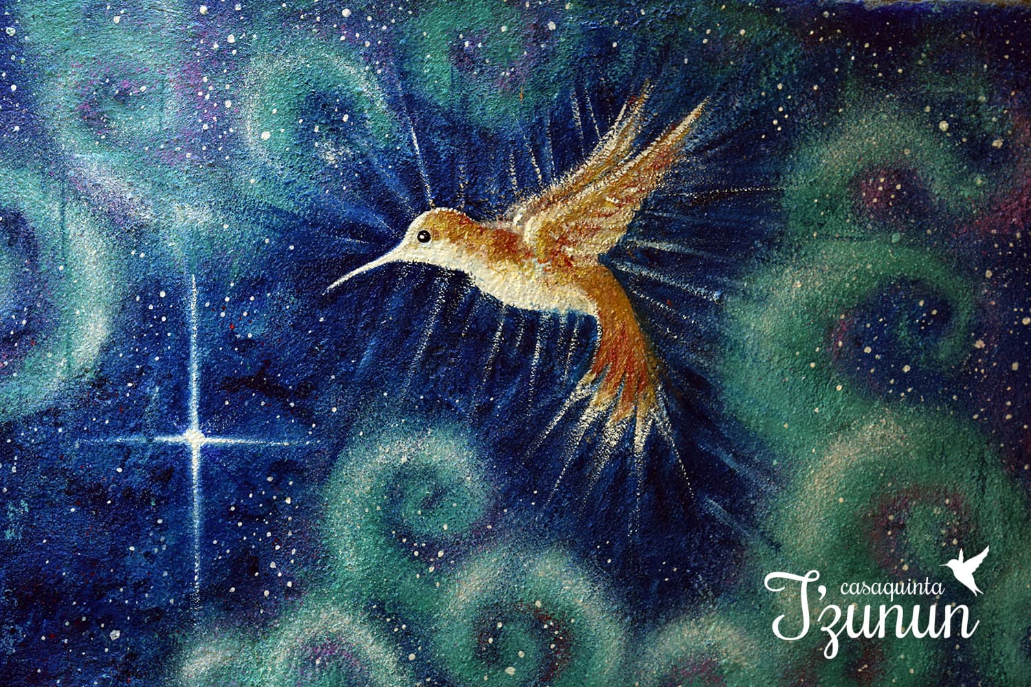 El colibrí es un ave que “encanta”. Su cuerpo es fino y pequeño. Está cubierto con un delicado plumaje iridiscente, como si fuera una gota de lluvia iluminada por el sol. El incesante batir de sus alas le permite sostenerse en un punto exacto en el espacio para chupar el néctar de la flor. “Dominan el arte de volar”, agregó el Clarinero. Su nombre en idioma maya es “tz’unun”, porque evoca el zumbido de su prodigioso aleteo.